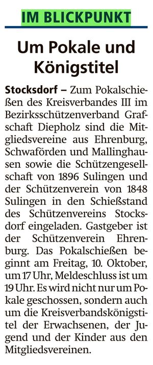Der Kreisverband III lädt alle Mitgliedsvereine zum Pokalschießen, in diesem Jahr auf den Stand des SV Stocksdorf ein, Ausrichter ist der SV Ehrenburg. Meldeschluss ist um 19:00 Uhr.