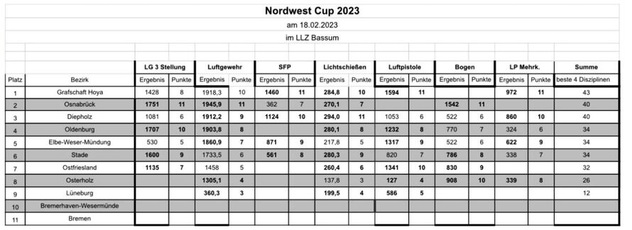 Unsere 22 Nachwuchsschützen waren sehr erfolgreich beim Nordwest Cup 2023 im LLZ Bassum - von 9 teilnehmenden Bezirksverbänden platzierten sie sich auf Rang 3 mit 40 Punkten, der Wanderpokal geht, wie auch in 2022, mit 43 Punkten an den Bezirk Hoya. GLÜCKWUNSCH!