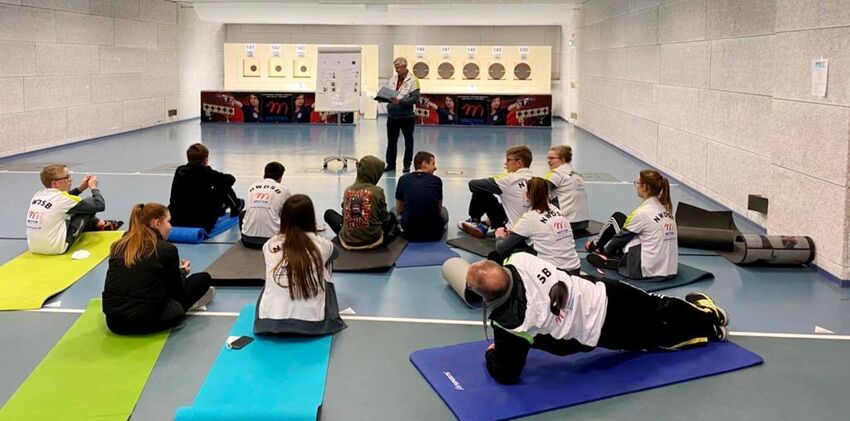 Nachdem wir alle gegen 10:30 Uhr angekommen waren, ging es, ganz ungewohnt, erstmal mit einer Sporteinheit los. Ralle (Ralf Richter) der eigentlich im Gewehrkader als Trainer tätig ist und privat sehr aktiv und vielseitig Sport treibt, hatte sich bereit erklärt für dieses Wochenende mitzufahren und uns grundlegende Übungen zu zeigen, die man ganz einfach in seinen Alltag einbauen kann. Nachdem alle auf dem Plan gesehen hatten, dass es dreimal täglich „Sport“ geben soll, haben alle die Hände über dem Kopf zusammengeschlagen. Allerdings hat Ralle da eine gute Balance gefunden. Morgens zum Wachwerden gab es eine intensivere Einheit, nach dem Mittagessen eine leichte Übungsphase, um aus dem Mittagstief herauszukommen und abends eine Entspannungsphase, bei der progressive Muskelentspannung und gezielte Entspannungsübungen für Schulter- und Nackenbereich durchgeführt wurden.
