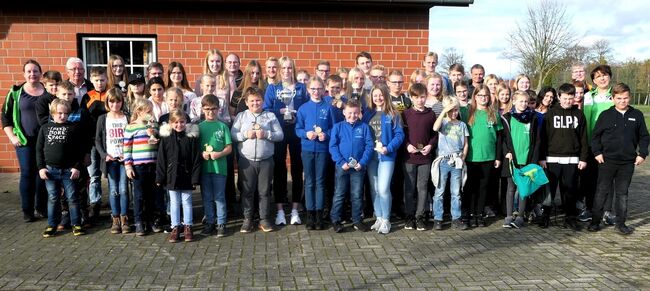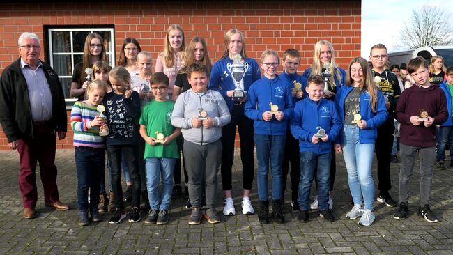 Alle platzierten Pokalgewinner strahlen um die Wette, in der Mitte Rieke Felstehausen vom SV Drebber v. 1900, sie hält stolz den von Friedel Kelkenberg gestifteten Wanderpokal in den Händen. Um sie herum die weiteren Pokalempfänger mit Pokalstifter u. Bezirksvizepräsident Friedel Kelkenberg (links)