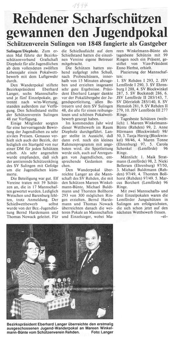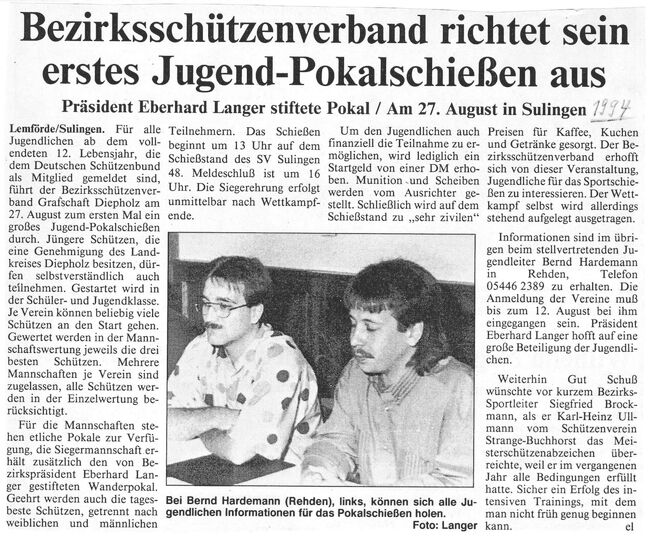 Beim Delegiertentag am 21. März 1994 im Landgasthaus Kastens in Schmalförden (KV III), hat Eberhard Langer einen Pokal für Schüler und Jugendliche gestiftet, um auf dem Gebiet der Jugendarbeit etwas neu zu bewegen. Dieser soll jährlich auf Bezirksebene ausgeschossen werden, in diesem Jahr am 27. August. Er überreichte die Trophäe der Bezirkssportleitung, mit dem Wunsch, dass man damit gemeinsam einen Schritt näher an die Jugend herankomme! Ab ca. 2010 bis heute steht Friedel Kelkenberg als Jugend-Wander-Pokalstifter in den Berichten.