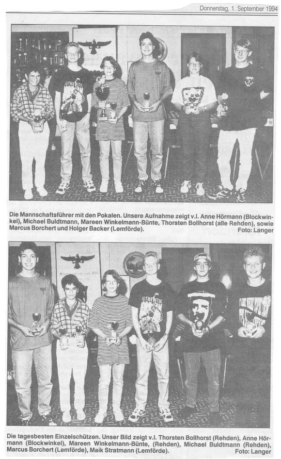Männlich: 1. Matthis Felstehausen SV Drebber von 1900 94/10/10 Ringe; 2. Justus Plenge SV Kirchdorf 94/10/9 Ringe; 3. Tristan Kastens SV Kirchdorf 87 Ringe.