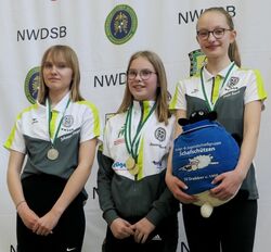 Die Mannschaft Schüler I Luftgewehr vom SV Drebber von 1900 mit Kira Evers, Finja Kunst und Lea Bonkowski platzierten sich mit 575,4 Ringen auf Rang 2 von 35 teilnehmenden Mannschaften, für sie gab es unter viel Beifall SILBER! Mit GOLD wurde die Mannschaft Schülerinnen I in der Disziplin 3x20 Schuss belohnt, sie setzte sich mit 1723 Ringen an die Spitze von 11 teilnehmenden Mannschaften! Johanna Ziegler, Finja Kunst und Kira Evers trugen mit ihren tollen Ergebnissen dazu bei. Die weiteren teilnehmenden Mannschaften waren mit der Luftpistole in der Schülerklasse I der SV Klein Lessen mit Emma Kukemüller, Lara Nordloh und Sina Raven. Ebenso beteiligten sich in der Schülerklasse I mit der Luftpistole der SV Diepholz mit Luna Becker, Laureen Wittig und Sophie Manzei.