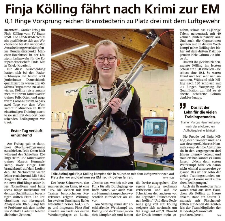 Die Landeskaderschützin Finja Kölling qualifizierte sich am Wochenende bei den nationalen Ausscheidungswettkämpfen im Bundesstützpunkt München-Hochbrück in der Disziplin Luftgewehr für die Europameisterschaft Ende Mai in Osiek (Kroatien).