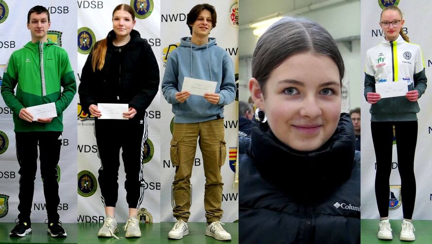 Auf dem Podest: Fiete Pohl (1. LP Schnellfeuer), Lea Carolin Hadeler (2. LP), Nikita Dikhtyar (3. LP Schnellfeuer), Lea Günther (2. LP Mehrkampf), Finja Kunst (LG-3-Stellung)