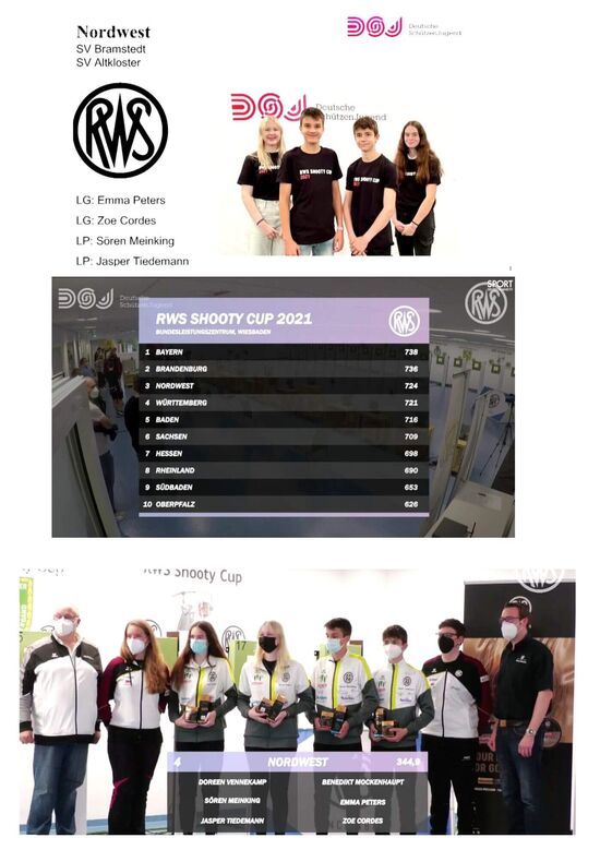 Aus unserem Landesverband waren vom SV Bramstedt Emma Peters und Zoe Cordes mit dem Luftgewehr sowie Sören Meinking und Jasper Tiedemann vom SV Altkloster mit der Luftpistole gemeldet (erstmals im DSB-Leistungszentrum in Wiesbaden). Wer den Wettkampf über Sportdeutschland TV mitverfolgt hat, weiß was sie dort für starke Ergebnisse "hingelegt" haben, einfach toll. In der Qualifikation wurden sie unter den 10 teilnehmenden Landesverbänden 3. Im Finale hatten sie die DSB-Kaderschützen Doreen Vennekamp (LP) und Bennedikt Mockenhaupt (LG) zugelost bekommen. Es ging im Finale hin- und her, die Zehntelwertung machte es mehrfach ganz spannend, aber zum Schluß mussten sie sich gegen Würtenberg - 346,0 R. knapp mit 344,9 Ringen geschlagen geben, Rang 4 - Trotzdem GLÜCKWUNSCH!