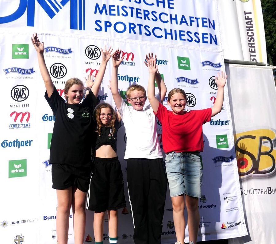 Unsere glücklichen Teilnehmer an der 1. Deutschen Meisterschaft im Lichtschießen in Frankfurt am Main am 9. und 10. August im LLZ des Hessischen Schützenverbandes. Lina Breywisch, Milja Schmitt vom SV Kirchdorf, Hannes Meyburg vom SV Drebber von 1900 und Leonie Kukemüller vom SV Klein Lessen (von links)