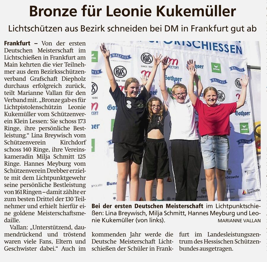 BRONZE gab es für Lichtpistolenschützin Leonie Kukemüller vom SV Klein Lessen u. gleichzeitig bekam sie für ihre persönliche Bestleistung von 173 Ringen, noch die Goldene Meisterschaftsmedaille. Diese erhält man nur, wenn man mit seinem Ergebnis im ersten Drittel der Teilnehmer ist! Betreut wurde sie sehr gut von Vereinskollege Theo Borchers-Rohde.