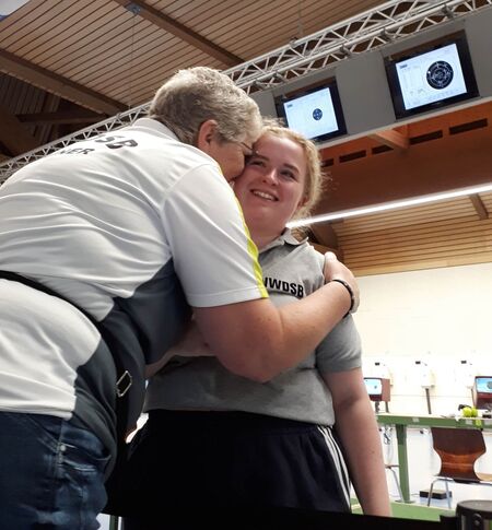 Sie war so was von glücklich über ihr DM-Ergebnis, denn sie war ja mit einem Defizit an Trainingseinheiten mit der Luftpistole (LP) angereist. Ihr Abi war ihr verständlicher Weise wichtiger in dieser "Klausurzeit", als das Trainieren mit der LP. Um so größer war Freude über solch ein Ergebnis.