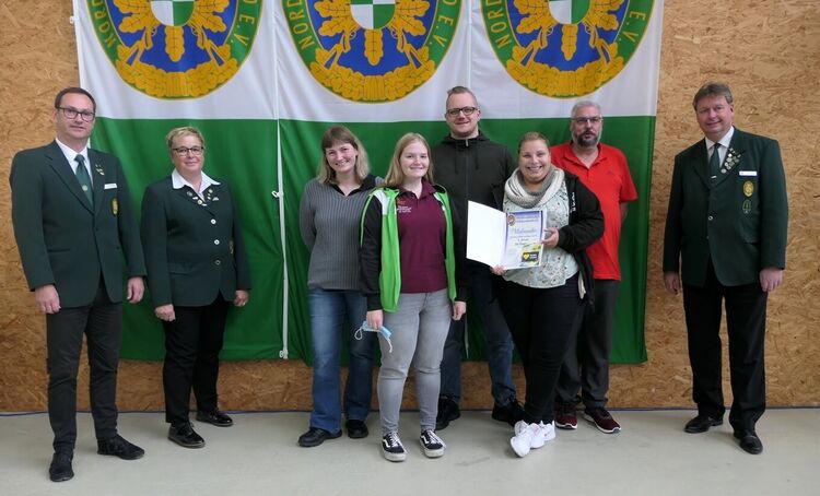 Ja so sehen Sieger aus, eingerahmt von NWDSB-Sportleiter Volker Kächele, Damenleiterin Renate Viebrock und NWDSB-Präsident Frank Pingel: Melanie Kleimann, Vanessa Rothe, Jannik Bollmeier, Nicole Bollmeier und Rainer Wittig.