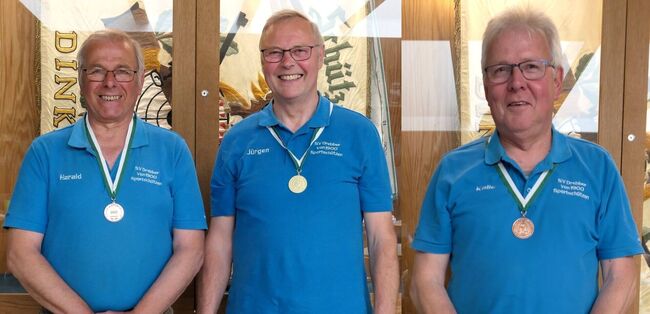 Es war unglaublich, an Tag 2 der Landesverbandsmeisterschaft 50m Kleinkaliber Gewehr Auflage gab es für die Drebberaner GOLD für die Mannschaft Senioren III! Dazu Einzelmedaillen für Jürgen Harzmeier GOLD, für Harald Backer und Karl-Heinz Brandt BRONZE! Damit hatte niemand gerechnet, da sie meinten ihre Ergebnisse wären nicht "gut genug". Aber man wurde eines Besseren belehrt. Nach dem letzten Durchgang wurden die aktualisierten Ergebnisse ausgehängt. Da sah man glückliche Gesichter!!