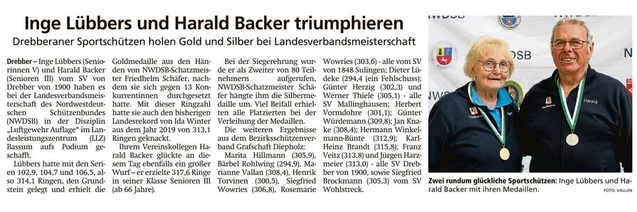 Inge Lübbers (Seniorinnen V) und Harald Backer Senioren III) vom SV von Drebber von 1900 haben es bei der diesjährigen Landesverbandsmeisterschaft Luftgewehr Auflage aufs Podium geschafft!