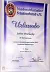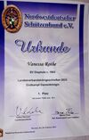 Vanessa Rothe vom SV Diepholz von 1953 wurde von ihrem Partner Daniel Wilker begleitet. NWDSB-Sportleiter Volker Kächele verlas die Teiler-Ergebnisse: Vanessa konnte sich mit einem Teiler von 16,1 letztlich als neue Landesverbandsdamenkönigin durchsetzen. NWDSB- Präsident Frank Pingel hängte ihr unter dem Jubel aller die Landesköniginnenkette um. Sabine Prochazka wurde mit einem sehr guten Teiler von 5,8 Landes-Vize-Alterskönigin, also insgesamt für beide ein toller Erfolg!