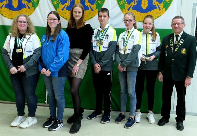 Hier "unsere" erfolgreichen Bezirks-Nachwuchsschützen mit Bezirkssportleiter Siegfried Brockmann (rechts) Lena Löhmann, Finja Kölling, Pia Goldmeyer, Fiete Pohl, Finja Kunst, Lena Carolin Hadeler (von links)