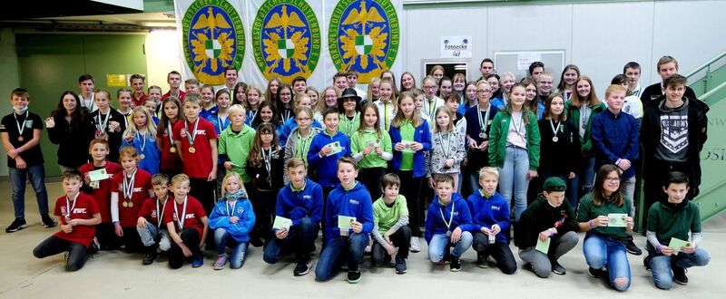 Erst wurden die Leistungen der NWDSB-Jugend bei der Landesverbandsmeisterschaft und Deutschen Meisterschaft mit Medaillen und Urkunden belohnt (hier das Gesamtfoto)