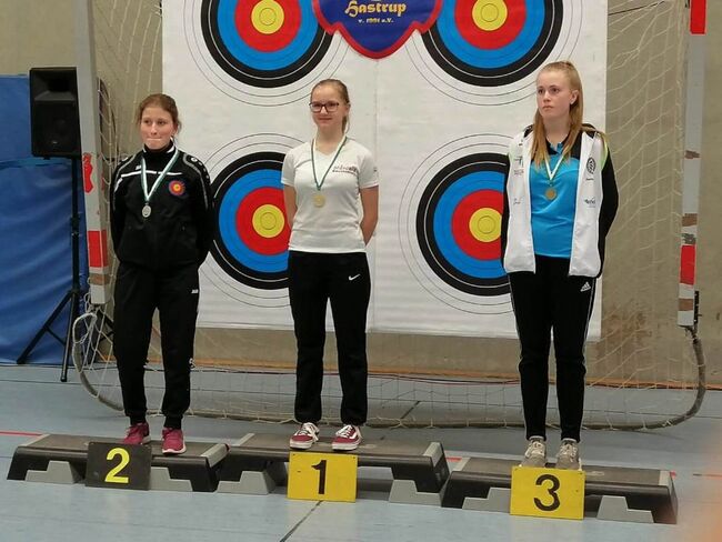 Unsere jüngste Teilnehmerin Jessica Emker vom Schützenverein Dörrieloh (rechts), erzielte in der Jugendklasse mit dem Recurvebogen 508 Ringe, damit nahm sie den Bronzeplatz ein! Vereinstrainer Rolf Möhlenbrock, Vater Stephan und Bernhard Trachsel standen ihr zur Seite und waren natürlich mit die ersten Gratulanten.