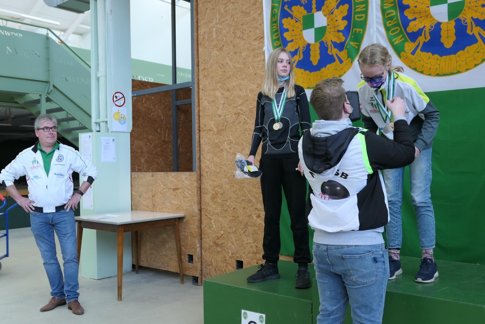 Betreuer Jörg Felstehausen mit "seinen" erfolgreichen Nachwuchsschützinnen Kira Evers und Finja Kunst. Zu vermerken ist, dass Kira nun auch in den Nachwuchskader des NWDSB aufgenommen wurde.