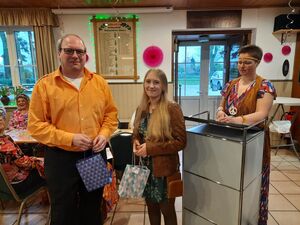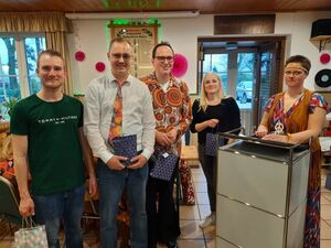 Weitere Glückwunsche und Geschenke gab es von Bürgermeister Heino Mackenstedt und Klaus Bollhorst als Vertreter des Kreisverbandes I. Nach dem offiziellen Teil übernahm Entertainer und Zauberer Ash die Unterhaltung, zuerst eine magische Zaubershow, anschließend spielte er als DJ die passende Musik aus den 70er.