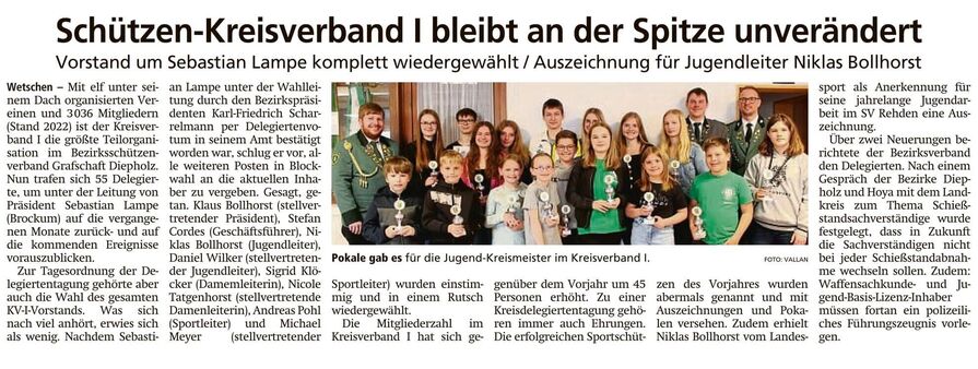 Präsidenten Sebastian Lampe erwähnte in seinem Rechenschaftsbericht, dass beim vergangenen Delegiertentag Stefan Cordes zum Geschäftsführer gewählt wurde, damit sei der Vorstand nun komplett. Alle wären nun froh, das Corona wohl auf dem Rückzug sei, und die Schützenfeste konnten wieder normal gefeiert werden. Das Kreiskönigstreffen fand in einem kleineren Rahmen in Kuppendorf statt. Der Bezirkskönigsball in Varrel war auch gut besucht. Das Damenvergleichsschießen des Bezirks fand auch statt, dort haben die Damen den zweiten Platz belegt. Beim Vergleichsschießen der vier Kreisvorstände gab es in diesen Jahr für den KV I den Wanderpokal! Waffensachkunde- und Schießwartlehrgänge wurden vom  Bezirk durchgeführt. Der Kreisverband I stellt sogar in 2023 die NWDSB-Landesverbandskönigin, es ist Vanessa Rothe vom SV Diepholz 53. Die Kreismeisterschaft 2023 ist wie immer hervorragend von den Schießwarten organisiert und durchgeführt worden. Bei der Bezirksdelegiertenversammlung in Barnstorf, sind 30 Ehrungsanträge aus sieben Vereinen berücksichtigt worden. Die Jugendarbeit hat im Kreisverband einen sehr hohen Stellenwert und durch die Mitgliedschaft in den Verbänden haben die Vereine die Möglichkeit den Kindern und Jugendlichen entsprechende Wettbewerbe anzubieten. Viele Kinder, Jugendliche und Erwachsene haben an diversen Wettkämpfen auf Verbands-, Landes- und Bundesebene teilgenommen und richtig gute Ergebnisse erzielt. Er dankte allen, die an den Wettbewerben teilgenommen haben und vor allem an die Trainer, Schießwarte und Jugendbetreuer, die all das erst ermöglichen. Sehr erfreulich ist, das sich die Mitgliederzahl gegenüber dem Vorjahr um 45 Mitglieder erhöht hat. Dann bedankte er sich abschließend bei seinem gesamten Vorstand für die sehr gute Zusammenarbeit. Dem Kassenwart wurde von den Prüfern vom SV Wetschen Andreas Langhorst und Horst Meins eine übersichtliche und ordnungsgemäß geführte Kasse bestätigt, eine Entlastung wurde erteilt.