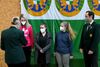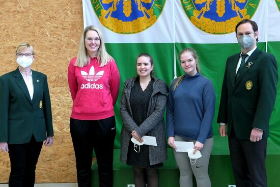 Glückliche "Landesverbands-Königsanwärterinnen" Jara Hesselelder vom SV Godensholt-BZ Oldenburg, Nele Brümmer von der SGi Oldendorf- BZ Stade u. Vanessa Rothe vom SV Diepholz von 1953, eingerahmt von Insa Helms u. Volker Kächele.