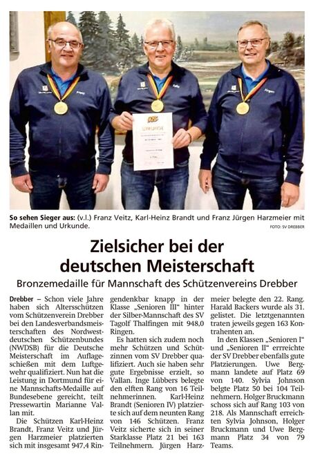 Schon viele Jahre haben sich Altersschützen vom Schützenverein Drebber von 1900 bei den Landesverbandsmeisterschaften des Nordwestdeutschen Schützenbundes (NWDSB), für die Deutsche Meisterschaft (DM) im Luftgewehr Auflageschießen in Dortmund qualifiziert. Nun im Jahr 2021 hat es endlich mit einer Mannschafts-Medaille geklappt!