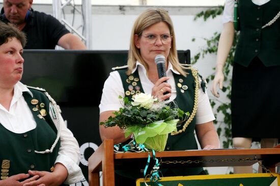 Ebenso begrüßte sie Bürgermeister Gerd Göbberd, den Ehrenpräsidenten Manfred Hillmann, Marianne Vallan und Dieter Lüdeke vom Kreisverband III, sowie die Majestäten Andreas Wilkens „der Hufschmied“, Tasja Hillmann „die Lebensfrohe“ und Meilo Hillmann „der Kartfahrer“. Sie bedankte sich an dieser Stelle nochmals beim Spielmannszug Schwaförden unter der Stabführung von Ingmar Braunert und der Feuerwehr für die Verkehrssicherung. Gerade eben beim Einmarsch der Schwafördener Damen, konnte man sich davon überzeugen, dass die Damenschießgruppe auch heute noch lebt und mit Schwung am Vereinsleben teilnimmt. Ja, wer den Zeitungsartikel vom Vortag genau gelesen hat, könnte vermuten, dass die Gruppe am Aussterben ist. Dem ist nicht so und der Artikel ist leider nicht im Sinne der Damen ausgefallen.