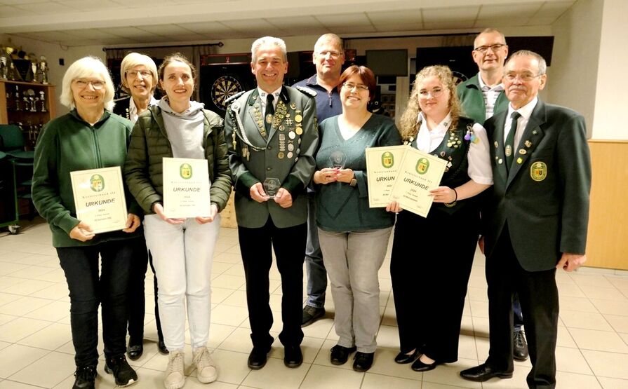 Ztg.- KV III - Anett Schulze sichert sich Titel der Kreisverbandskönigin_24.10.2024.pdfDie Pokalsieger und Tagesbesten des KV III mit ihren Urkunden: Rosemarie Wowries, Sabine Prochazka, Ellen Winte, Tagesbester Udo Bolte, Jörg Wulferding, Tagesbeste Andrea Bolte, Lena Löhmann, Heiko Kesten und KV III-Präsident Dieter Lüdeke