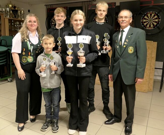 Die Sieger Pokale und Tagesbesten Schüler und Jugend mit Lena Löhmann, Fiete Schulz (Tagesbester Schüler), Marian Becke, Danica Wiegmann (KV-Kinderkönigin), Jayden Diephaus (KV-Jugendkönig) und Präsident Dieter Lüdeke (von Links)