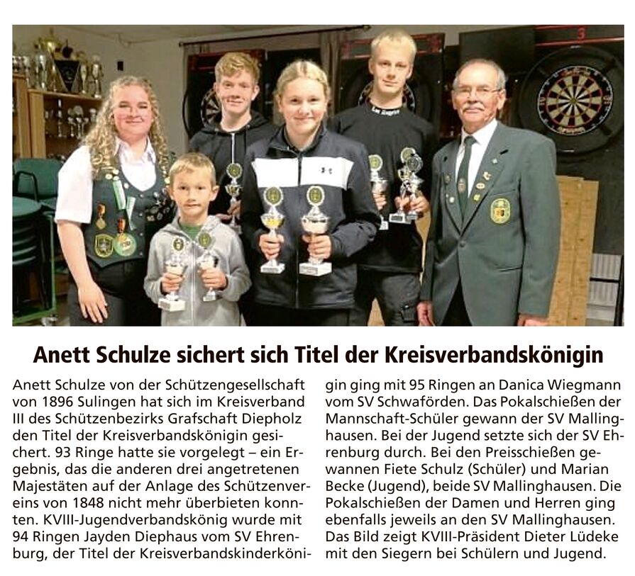 Kreisverbandskinderkönig 2024 wurde mit 95 Ringen Danica Wiegmann vom SV Schwaförden. 2. wurde Fiete Schulz vom SV Mallinghausen mit 90 Ringen.