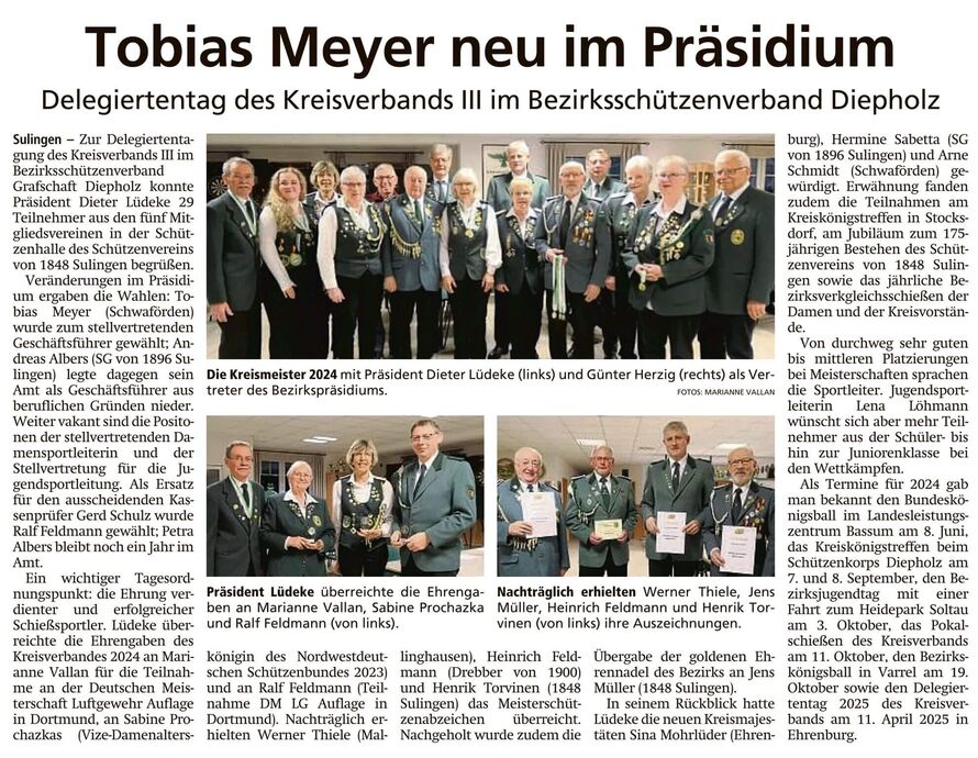 Präsidenten Lüdeke berichtete rückblickend vom Jahr 2023: Im Juni 2023 war er mit Günter Herzig, Sabine Prochazka und Marianne Vallan zur Beerdigung von Schützenbruder Hermann Hartau. Dieser war 9 Jahre Kreissportleiter gewesen. Am 20. Juli 2023 besuchte er das Fest des 175 jährigen Jubiläum des SV von 1848 Sulingen. Das regnerische Wetter konnte man nicht beeinflussen, aber sonst war es eine gelungene Veranstaltung. Beim Kreisverbands-Pokalschießen sicherte sich Sina Mohrlüder vom SV Ehrenburg bei den Erwachsenen den Kreiskönigstitel, Hermine Sabetta von der SG von 1896 Sulingen wurde Jugendkönigin und Arne Schmidt vom SV Schwaförden freute sich über den Kinderkönigstitel. Es gab ein erfolgreiches Kreiskönigstreffen im Kreisverband III, die Veranstalter waren der SV Ehrenburg und der SV Stocksdorf. Von der Planung, übers Schießen bis hin zur eigentlichen Veranstaltung war es ein Erfolg auf ganzer Linie. Bei den Vergleichsschießen der Kreisvorstände und der Damen, ausgetragen auf dem Stand des SV von 1848 Sulingen, sicherte man sich wieder die „Rote Laterne“. Beim NWDSB-Landesschützentag in Stade war der Bezirk in diesem Jahr mit Doris Hülsmann vom SV Rehden als Königsanwärterin vertreten. Sie wurde als 1. Prinzessin der Landesalterskönigin proklamiert. Der Ball am Abend war eine sehr schöne Veranstaltung, besser als die im vergangenen Jahr. Da sich am Nachmittag bis zum Schluss der Delegiertenversammlung noch kein Bezirk als Ausrichter des nächsten Landesschützentages beworben hatte, hat sich der Bezirk Diepholz für 2025 als Ausrichter beworben und unter großem Beifall den Zuschlag erhalten.