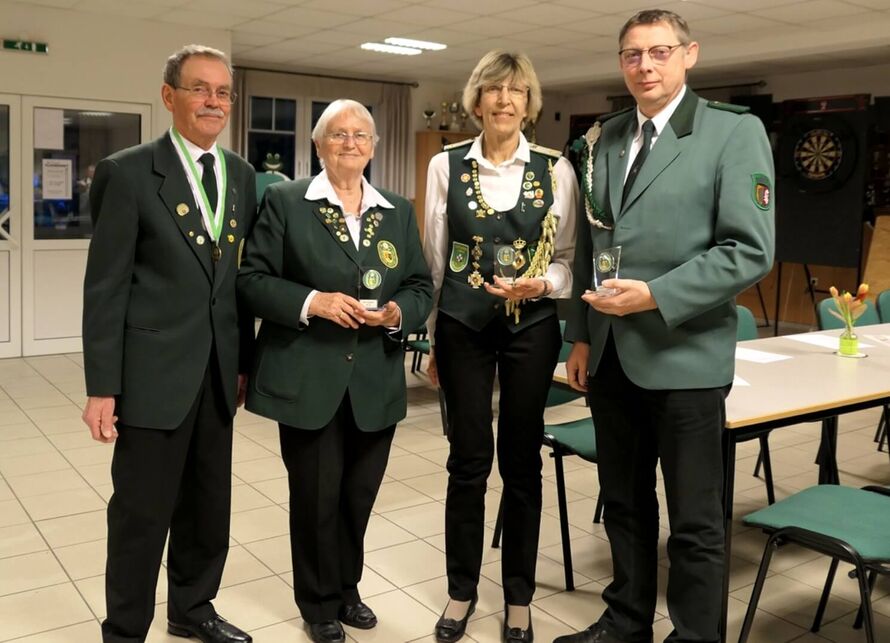 Präsident Lüdeke überreichte die Ehrengaben des Kreisverbandes 2024 an: Marianne Vallan für die Teilnahme an der DM LG Auflage in Dortmund, Sabine Prochazka erhielt sie als Vize-Damenalterskönigin des NWDSB, auch Ralf Feldmann erhielt sie für die Teilnahme DM LG Auflage in Dortmund. (von links)
