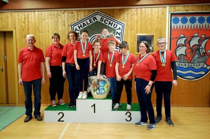 Die Teilnehmer vom SV Klein Lessen, zum Teil mit Medaillen geschmückt, in Bremen Blumenthal...