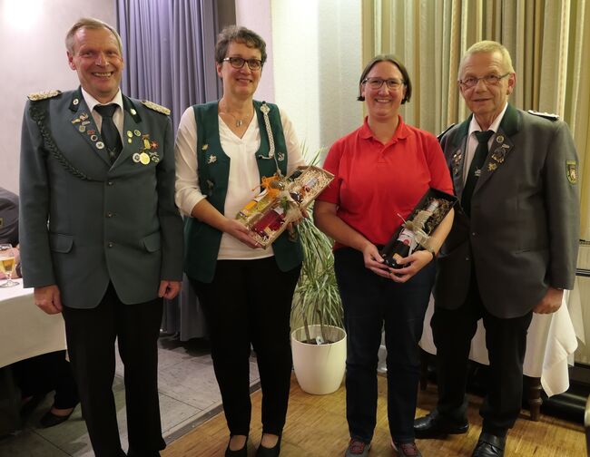 Anke Rohlfs vom SV Strange-Buchhorst erhielt für ihre LM-Silbermedaille und die Teilnahme an der Deutschen Meisterschaft jeweils einen guten „Tropfen“, ebenso Ina Roth vom SV Klein Lessen für ihren zweiten LM-Platz im Blasrohrsport. Eingerahmt von Präsident Gerd Griffel und Ewald Ehlers