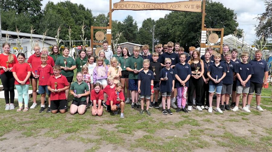 Die Sieger Biathlon vom KV IV beim Jugendzeltlager 2023 strahlen mit der Sonne um die Wette. Im Einzel und mit der Mannschaft haben sie Medaillen und Pokale für ihre tollen Leistungen erhalten.