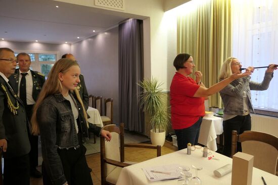 Nach den Ehrungen konnte man den Blasrohrsport ausprobieren, Cord und Ina Borchers-Rohde hatten extra ihre Blasrohrausrüstung mitgebracht, natürlich mit passenden "Blasrohren" und Pfeilen mit den dazugehörenden Zielen. Es haben nicht nur Kinder versucht und auch, nach Anleitung von Ina, getroffen, auch die „Großen“ haben es probiert.