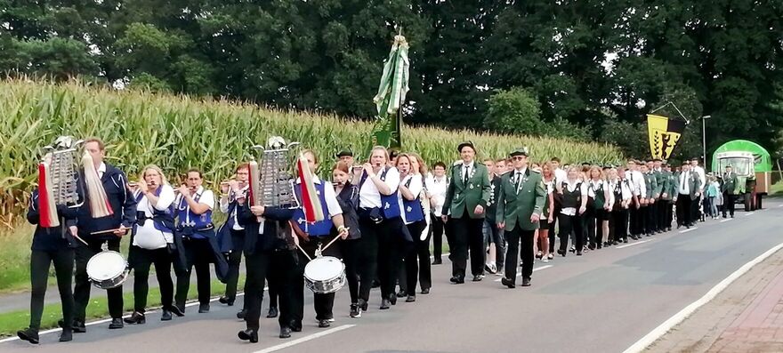 Angeführt vom Kinderkönig Robin Lück und dem Feuerwehr Jugend Spielmannszug aus Wehrbleck. Ihnen folgte der Wehrblecker König Marc Heitmann, und alle weiteren Pandemie Hoheiten und das Schützenvolk. In zwei Reihen, um den Abstand zu halten, marschierte man zum Schießstand des Schützenvereins Strange-Buchhorst.