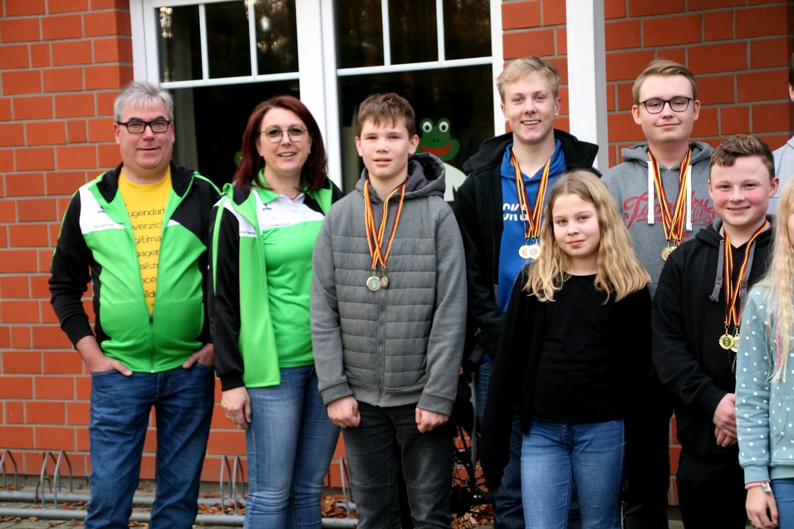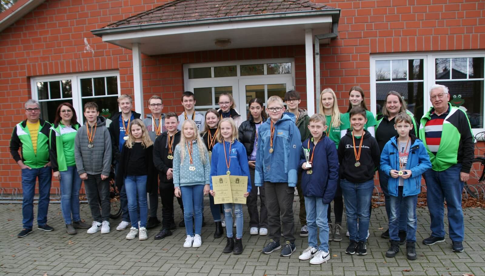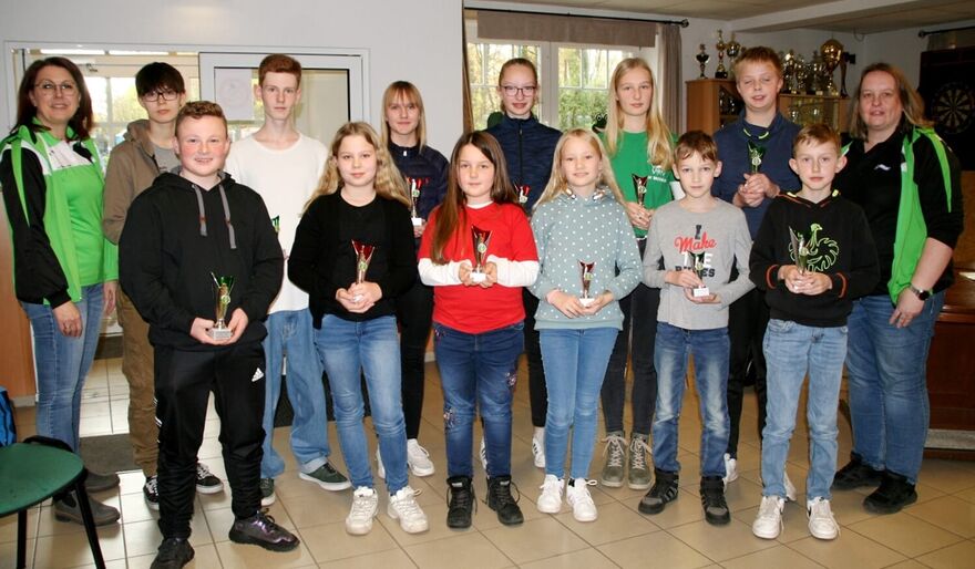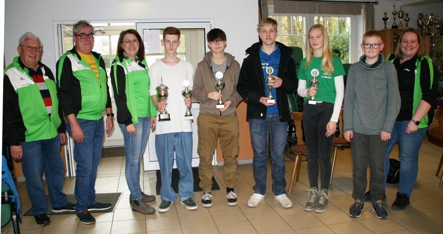 Abschlussfoto mit den jugendlichen Siegern der Bezirksmeisterschaft und des Rundenwettkampfes 2022 mit den Verantwortlichen von links: Gerd Harzmeier u. Anja Klanke-Luzniack u. von rechts Friedel Kelkenberg u. Britta Löhmann.