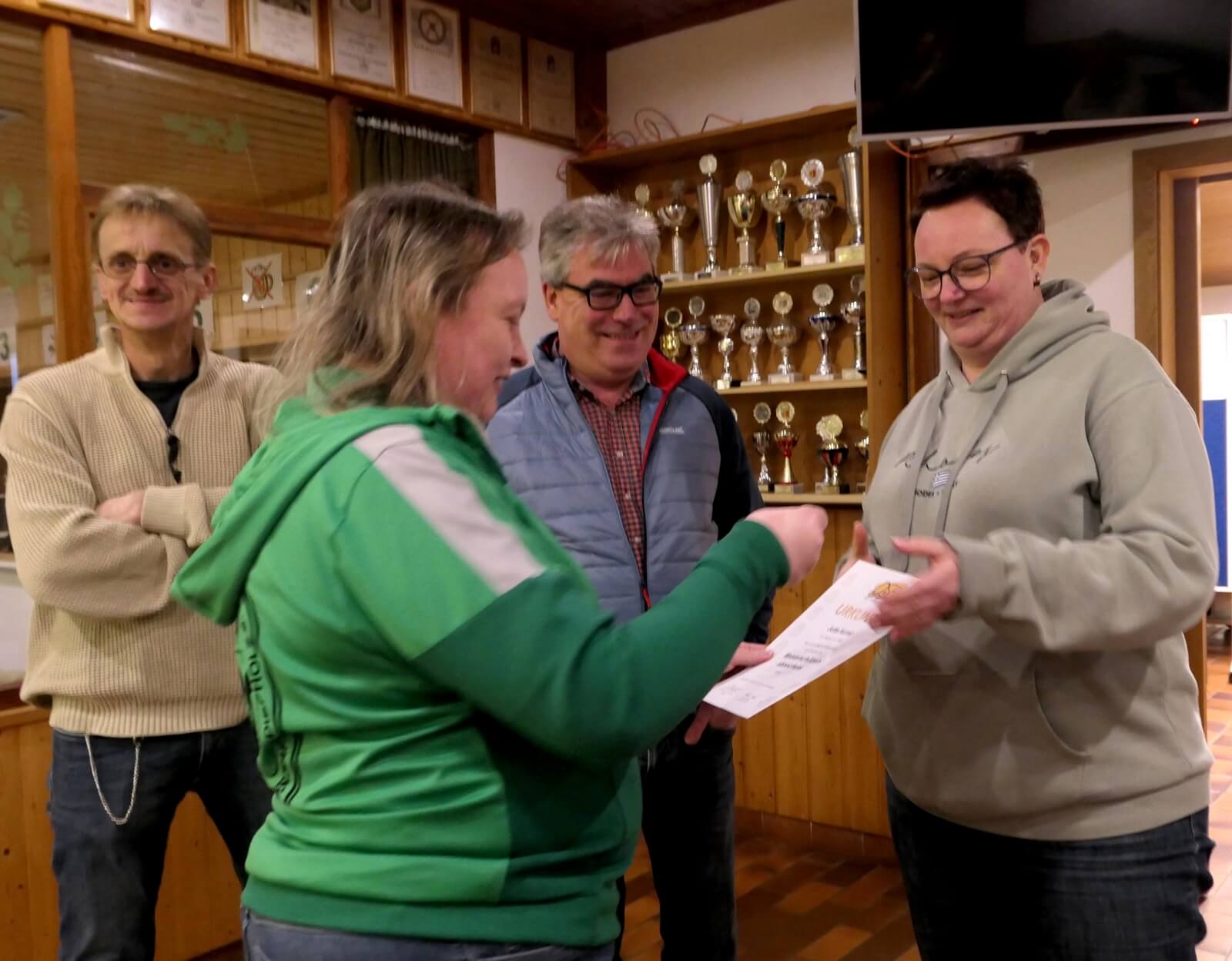 Bei dieser Gelegenheit überreichten Britta Löhmann und Gerd Harzmeier Finja Kunst und ihrer Mutter Jutta mit Glückwünschen ihre Meisterschützenabzeichen mit Urkunden.