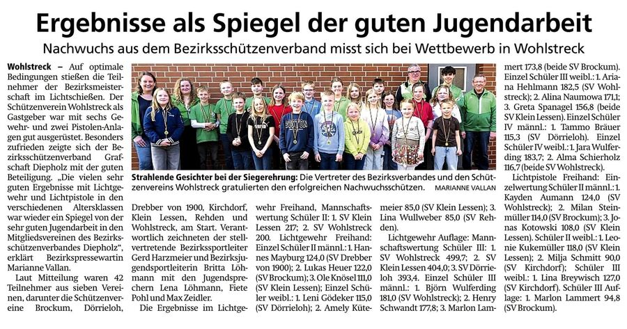 BM-Ergebnisse_2025_Lichtschießen.pdfVon der diesjährigen Bezirksmeisterschaft Lichtschießen, konnte stellv. Bezirkssportleiter Gerd Harzmeier berichten, dass aus unserem Bezirk 42 Teilnehmer aus 7 Vereinen angetreten waren. (Brockum, Dörrieloh, Drebber von 1900, Kirchdorf, Klein Lessen, Rehden u. Wohlstreck)
