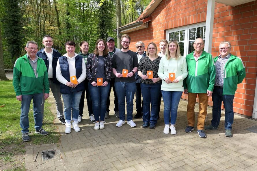 10 glückliche Inhaber einer Schießleiter-Lizenz: Mark Schier (SK Diepholz), Bianca Walther (SV Schwarme/BZ-Hoya), Alexandra Focke (SSG Lähden/BZ-Osnabrück), Karen Kunst (SV Strange-Buchhorst), Sven Walther (SV Schwarme/BZ-Hoya), Lukas Bolte (SV Mallinghausen), Maximilian Bissinger (SV Ossenbeck/SK Diepholz), Yvonne Weßels (SV Ehrenburg), Hannes Bruns (SSG Lähden/BZ-Osnabrück), Nele Denker (SV Ehrenburg). Eingerahmt von Bezirkssportleiter Siegfried Brockmann, den BZ-Waffensachkunde-Referenten Horst Brinkmann u. Ulrich Ehlers.