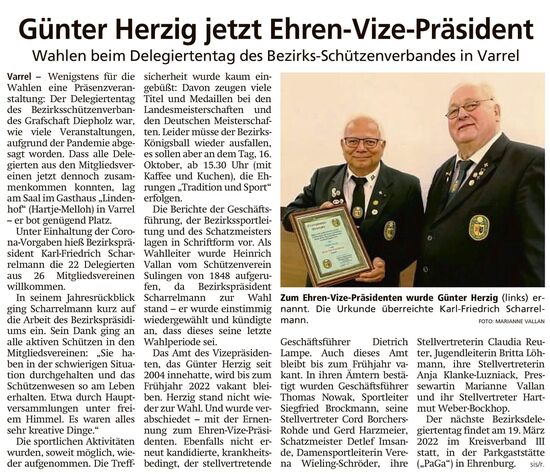 Als Wahlleiter wurde Heinrich Vallan vom Schützenverein Sulingen von 1848 aufgerufen, da der bisherige Bezirkspräsident Karl-Friedrich Scharrelmann zur Wahl stand. Dieser wurde einstimmig wiedergewählt, er nahm die Wahl an und bedankte sich für das Vertrauen, gab aber auch klar zum Ausdruck, dass dieses seine letzte Wahlperiode sei. Das Amt des Vizepräsidenten, welches Günter Herzig inne hatte, wird bis zum Frühjahr 2022 vakant sein, er stand zur Wahl nicht wieder zur Verfügung.