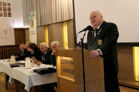 Die Feststellung der Anwesenheit übernahm Vizepräsident Günter Herzig, es waren von den 26 Mitgliedsvereinen 22 mit ihren Delegierten vor Ort. In seinem Jahresrückblick ging Bezirkspräsident Karl-Friedrich Scharrelmann kurz auf die Arbeit des Bezirkspräsidiums ein. Normaler Weise fanden die Delegiertentage immer im Frühjahr statt, sie mussten nun schon zum zweiten Mal auf den September verschoben werden. Sein Dank ging an alle aktiven Schützenschwestern und Schützenbrüder in den Mitgliedsvereinen. Sie haben in der schwierigen Situation durchgehalten und das Schützenwesen so mit am Leben erhalten. Da wurden Hauptversammlungen unter freiem Himmel abgehalten oder die Vereinsmitglieder mit dem Hofstaat zu Hause besucht. Es waren alles sehr kreative Dinge die unser Schützenwesen attraktiv gehalten haben. Die sportlichen Aktivitäten wurden soweit es möglich war wieder aufgenommen. Es konnten bei den Landesmeisterschaften in 2021 viele Titel und Medaillen gewonnen werden. Auch von der Deutschen Meisterschaft kann unsere Sportleitung sehr positives berichten.