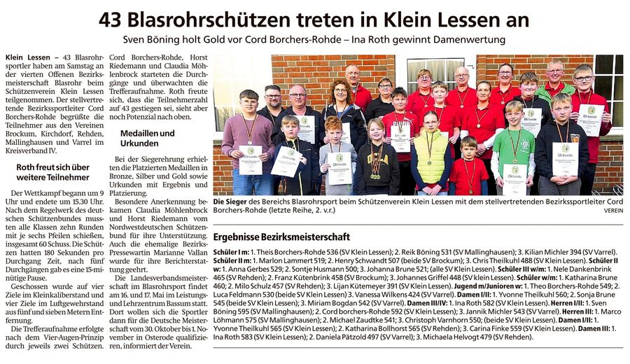 Die Bezirksmeisterschaft Blasrohr alle Klassen fand auch in 2026 beim SV Klein Lessen statt, die Teilnehmer kamen aus den BZ-Mitgliedsvereinen Brockum, Kirchdorf, Rehden, Mallinghausen und Varrel. Am 15. März fand im Kreisverband IV beim Schützenverein Klein Lessen Offene Bezirksmeisterschaft Blasrohr statt. Stellvertretender Bezirkssportleiter Cord Borchers-Rohde konnte 43 Blasrohrsportler auf dem Stand des Schützenvereins Klein Lessen zur 4. Offenen Bezirksmeisterschaft Blasrohr begrüßen, sein Gruß galt auch Kreisverbandspräsident Gerd Griffel. Es galt das Regelwerk der Sportordnung des deutschen Schützenbundes. 10 Runden a 6 Pfeile (60 Schuss) galt für alle Klassen. 2 Passen gab es zur Probe, anschließend 10 Passen (180 Sek. pro Passe) mit 15 min Pause nach 5 Passen. Die Trefferaufnahme erfolgt nach dem 4-Augen-Prinzip durch jeweils 2 Schützen. Es gab 4 Ziele im Kleinkaliberstand und 4 Ziele standen im Luftgewehrstand bereit, mit 5m und 7m Entfernung. Gestartet wurden die einzelnen Durchgänge von Cord Borchers-Rohde, Horst Riedemann und Claudia Möhlenbrock. Die Trefferaufnahme wurden von ihnen auch mit überwacht.