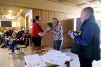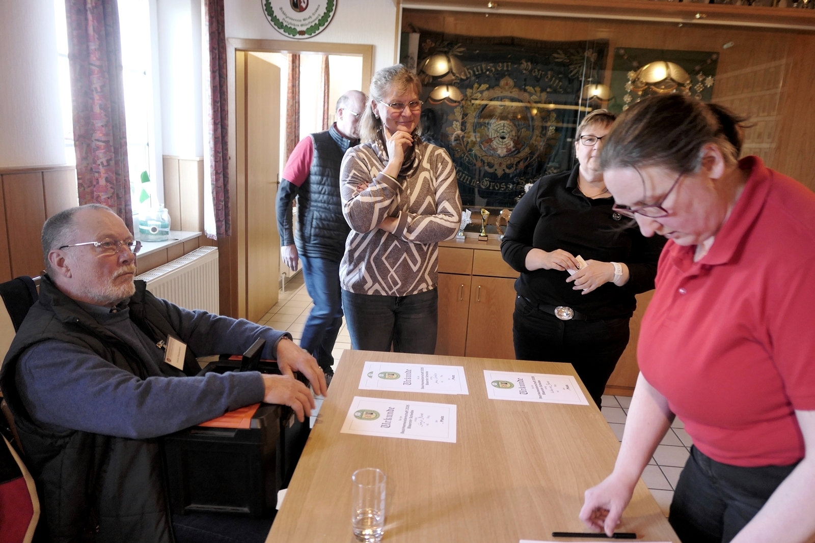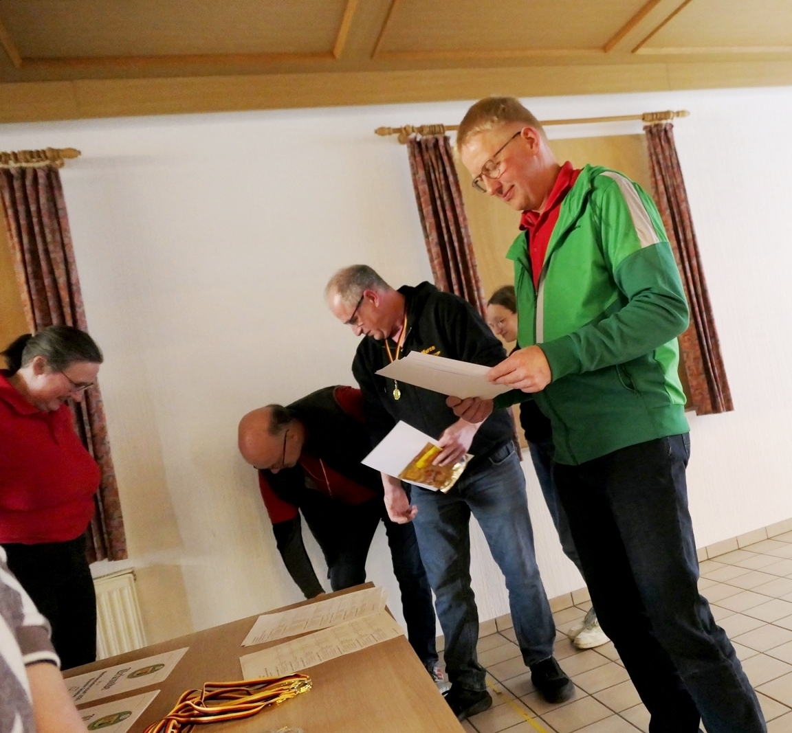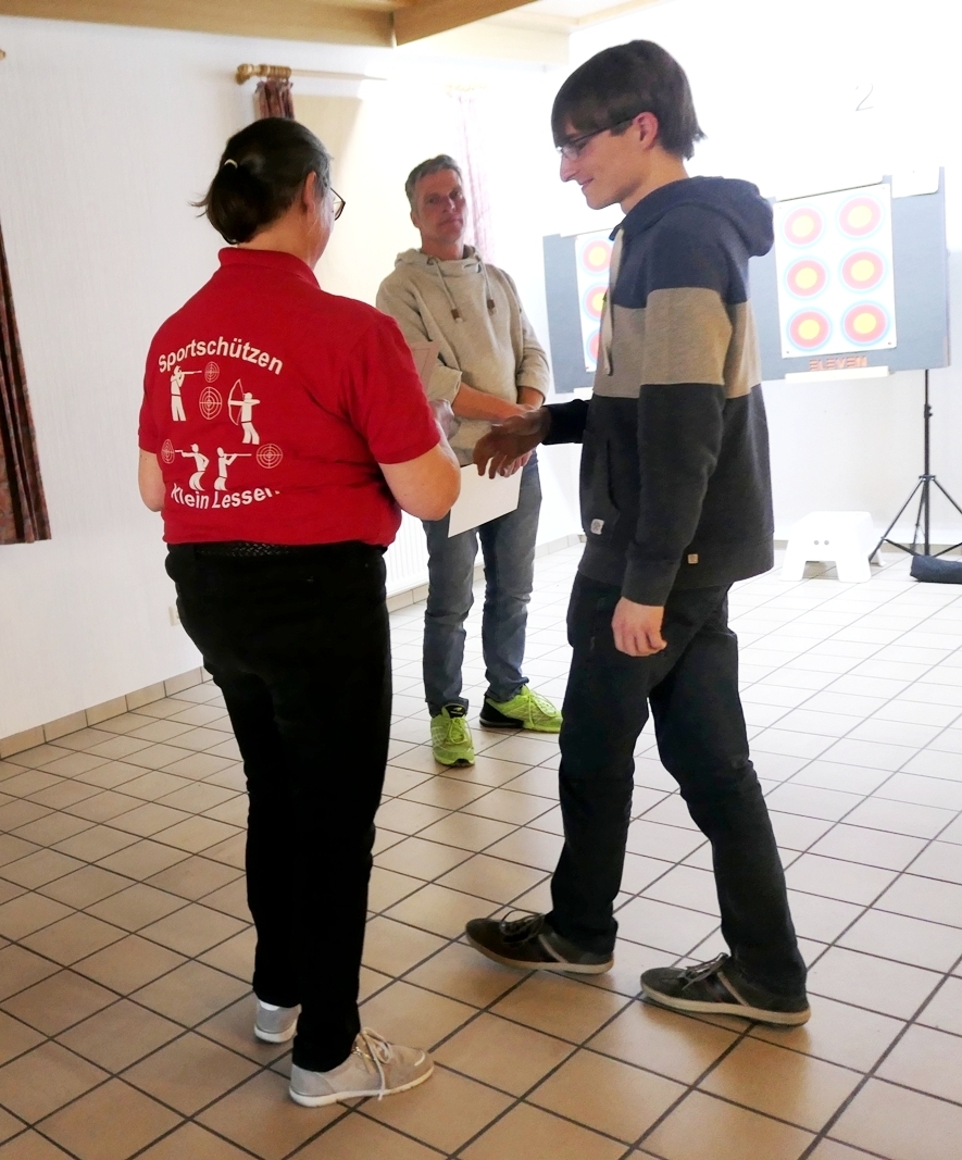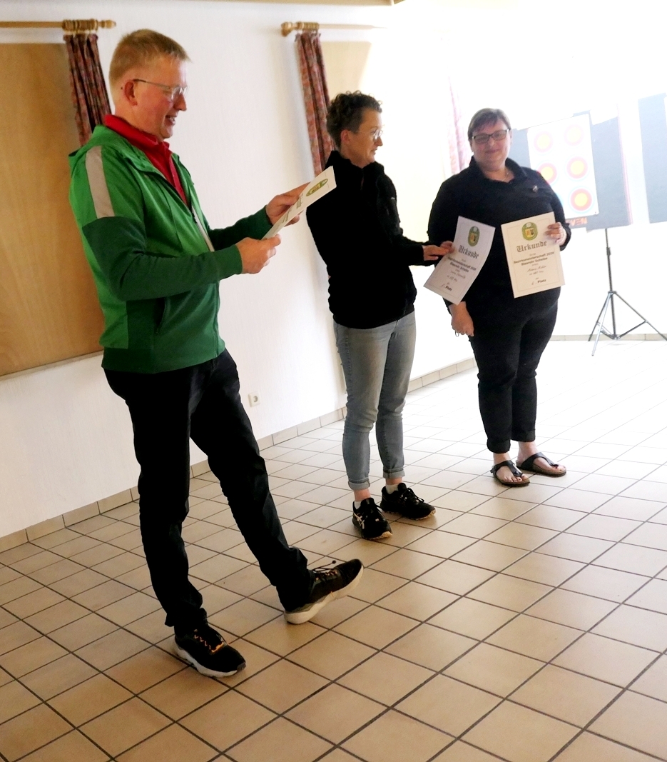 Vor der Siegerehrung ließ Ina Roth nicht unerwähnt, dass sich in diesem Jahr die Teilnehmerzahl wieder gesteigert habe, nämlich auf 43, natürlich ist noch Luft nach „oben“. Auch Cord Borchers-Rohde lobte die Blasrohrschützen, sie hätten alle einen hervorragenden Wettkampf "abgeliefert". Ihr beider Dank ging dabei besonders an ihre beiden Helfer vom NWDSB, an Claudia Möhlenbrock, der Referentin Blasrohrsport und Horst Riedemann. Sie kommen immer gern und helfen bei den Blasrohrveranstaltungen, auch in unserem Bezirk. Claudia erhielt eine „Wundertüte“ und eine Rose im Blumentopf, Horst erhielt von Ina die übrig gebliebenen Tafeln Schokoladen vom Wettkampf, denn je eine Tafel bekommt/bekam man als Belohnung, wenn 60 Ringe erzielt wurden.