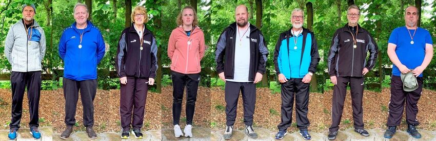 Die Bezirksmeister Bogen Fita im Freien 2022: Thorsten Meyer-Ahrens BS DH, Alfons Riesenbeck, Helga Twietmeyer, Jessica Emker, Heinz Maruschewski, Bernhard Trachsel, Hans-Georg Backhaus u. Daniel Raschke. (von links)