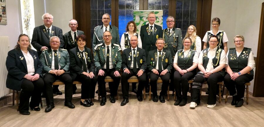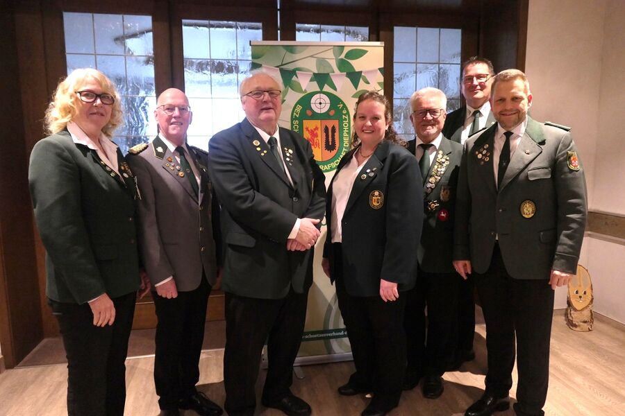 Der neue Bezirksvorstand 2026, sitzend von links: Präsidentin Britta Löhmann (SV Mallinghausen), Vizepräsident Ulrich Ehler (SV von 1848 Sulingen), Vizepräsidentin Anja Klanke-Luzniack (SSV Dümmer), Geschäftsführer Sebastian Lampe (SV Brockum), Sportleiter Siegfried Brockmann (SV Wohlstreck), Damensportleiterin Ina Roth (SV Klein Lessen, Jugendsportleiterin Jutta Kunst (SV Drebbrer von 1900). Pressewartin Katrin Meyburg (SV Drebber von 1900).