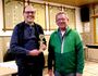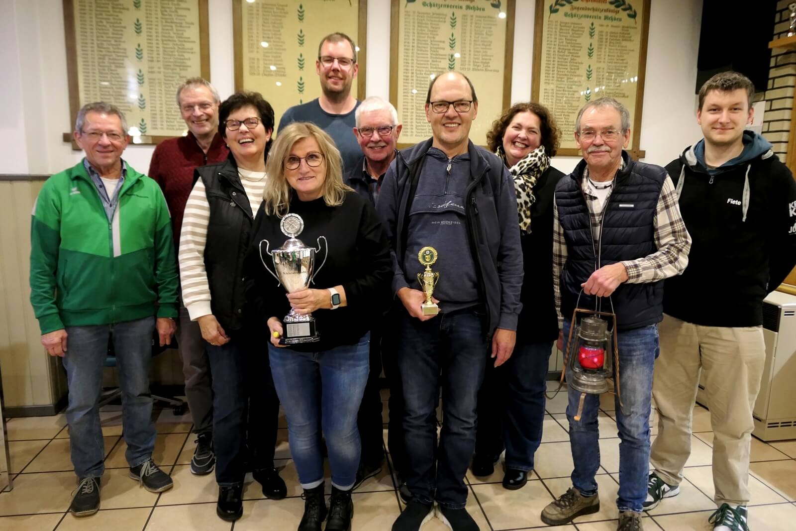 Bezirkssportleiter Siegfried Brockmann und Fiete Pohl mit den glücklichen Gewinnern des diesjährigen KV-Vergleichsschießens: Rainer Gaumann vom KV IV mit Tagesbesten- u. Wanderpokal, sowie KV III Präsident mit der "Roten Laterne".