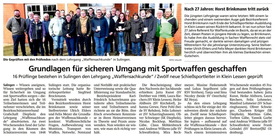 Der Bezirks-Schützenverband Grafschaft Diepholz richtet je nach Bedarf einmal jährlich eine Waffensachkunde-Ausbildung zur Schulung für verantwortliche Aufsichtspersonen auf Schießständen aus, auch in diesem Jahr. Alle 16 Teilnehmer erhielten die Bescheinigung über den Nachweis der Sachkunde.