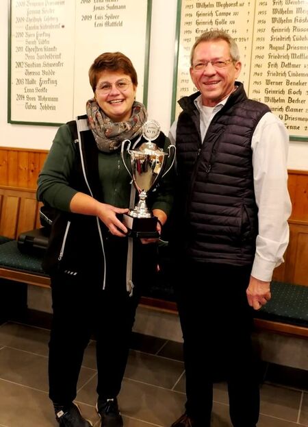Bianca Meyer, neue Präsidentin des KV II, war glücklich, dass sie gleich bei ihrem ersten öffentlichen schießsportlichen "Einsatz", diesen begehrten Pokal für ihren Kreisverband in Empfang nehmen durfte. (übrigens hatte sie auch selber dazu beigetragen mit "satten" 312,0 Ringen).