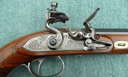 Bilder VL-Demo 005 + 006, Steinschloßpistole 25m, die Zündung erfolgt durch Funken die durch Reibung des im Hahn eingespannten Feuersteines an der Schlagfläche der Pulverpfannenabdeckung, der sogenannten " Batterie " entstehen und das Zündkraut auf der Pfanne entzünden. Diese Zündflamme dringt durch das Zündloch in den Pulversack der Waffe und zündet dort die Treibladung für das Geschoß.